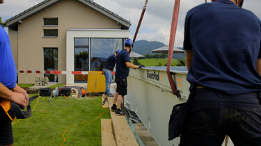 Heute steht der Einbau eines Pools an. Auf der Baustelle treffe ich unser Team und die Partnerunternehmen. Gemeinsam platzieren wir das Becken mit einem Kranfahrzeug an die vorbereitete Stelle. In den vergangenen Wochen haben wir hier die Technik installiert und die Leitungen verlegt. Es ist immer ein besonderer Moment, wenn das Becken seinen Platz einnimmt und der Fortschritt sichtbar wird.
